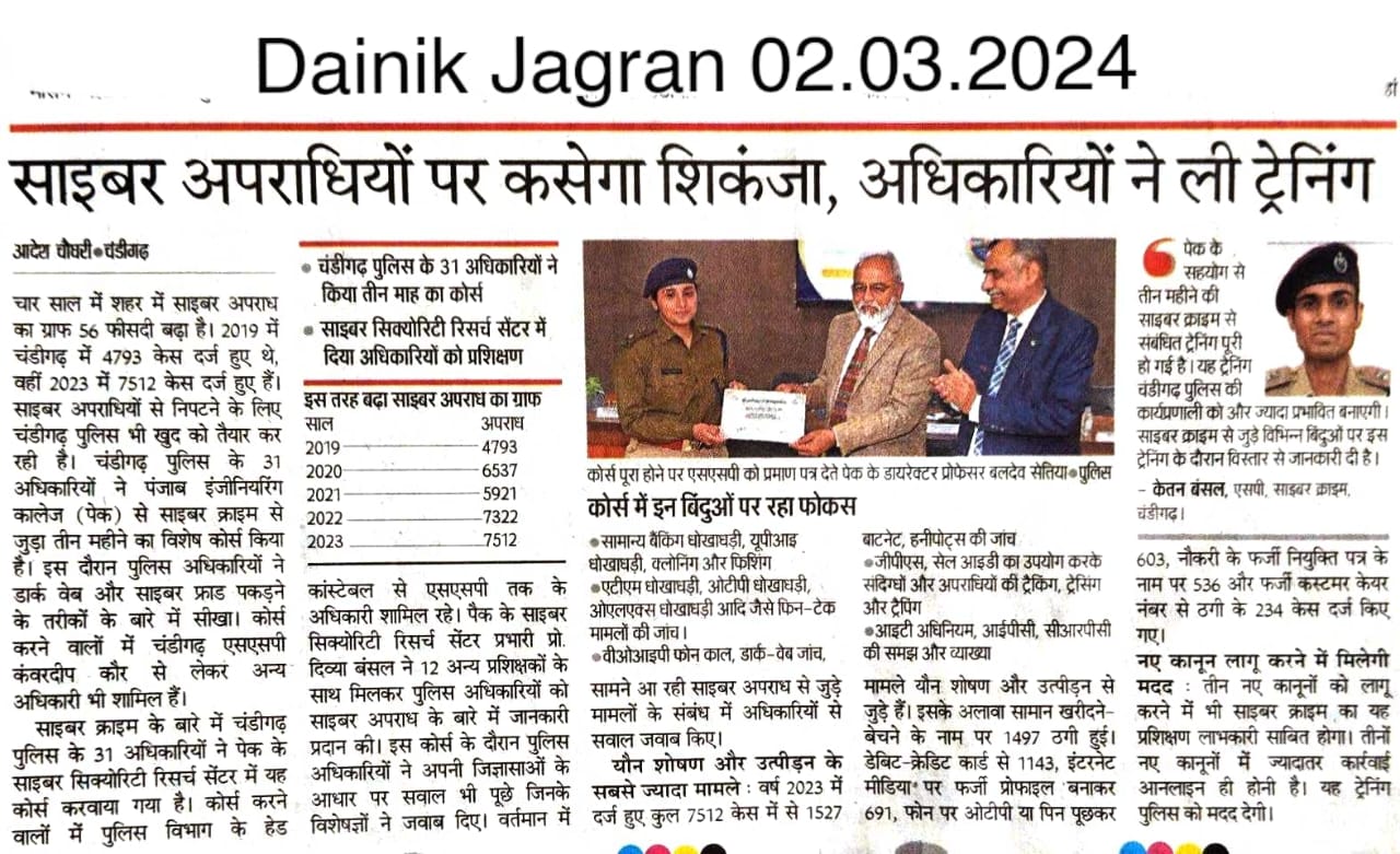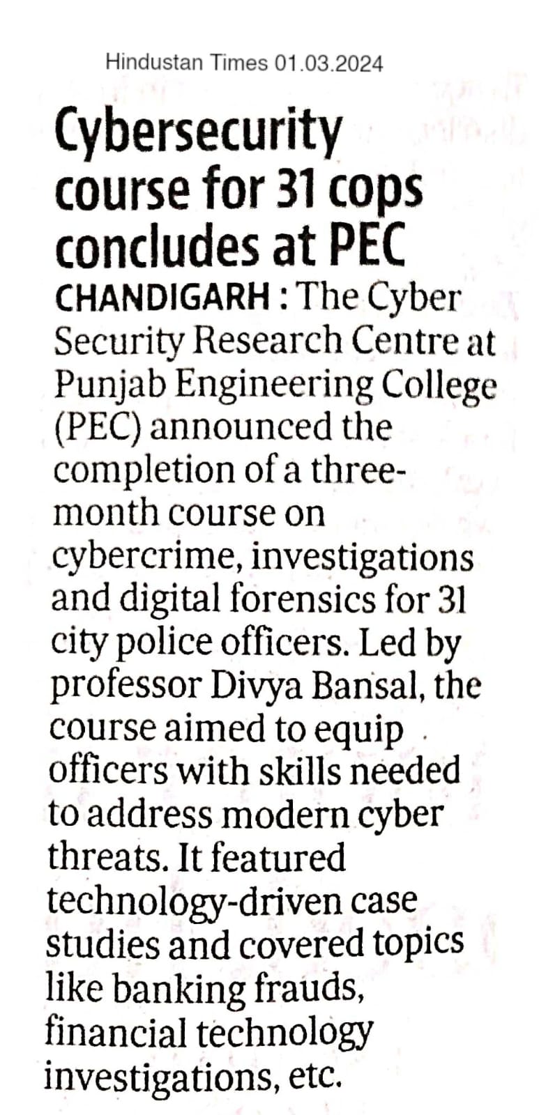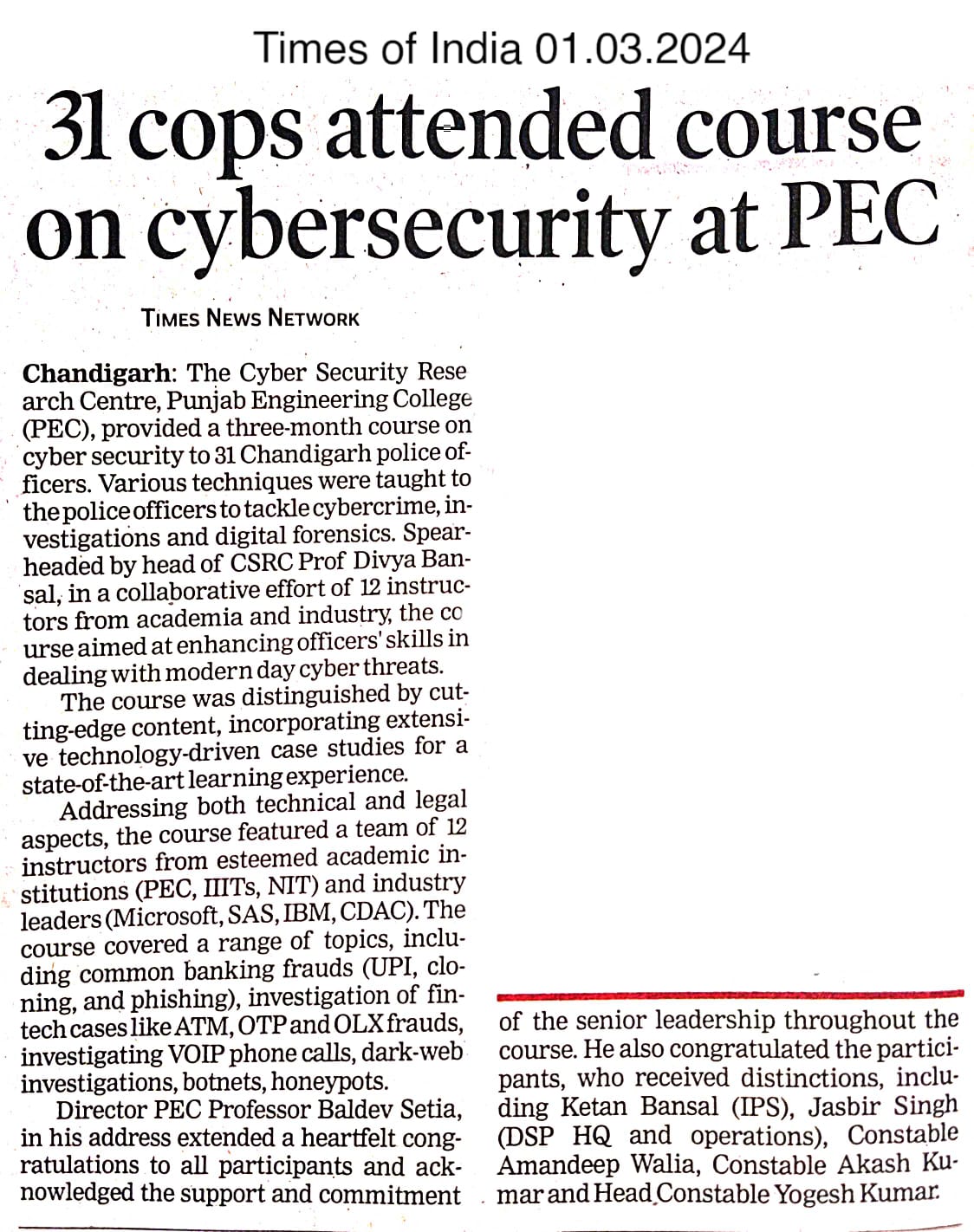 31 City Police Officers completed the Cyber Security course at PEC Chandigarh |