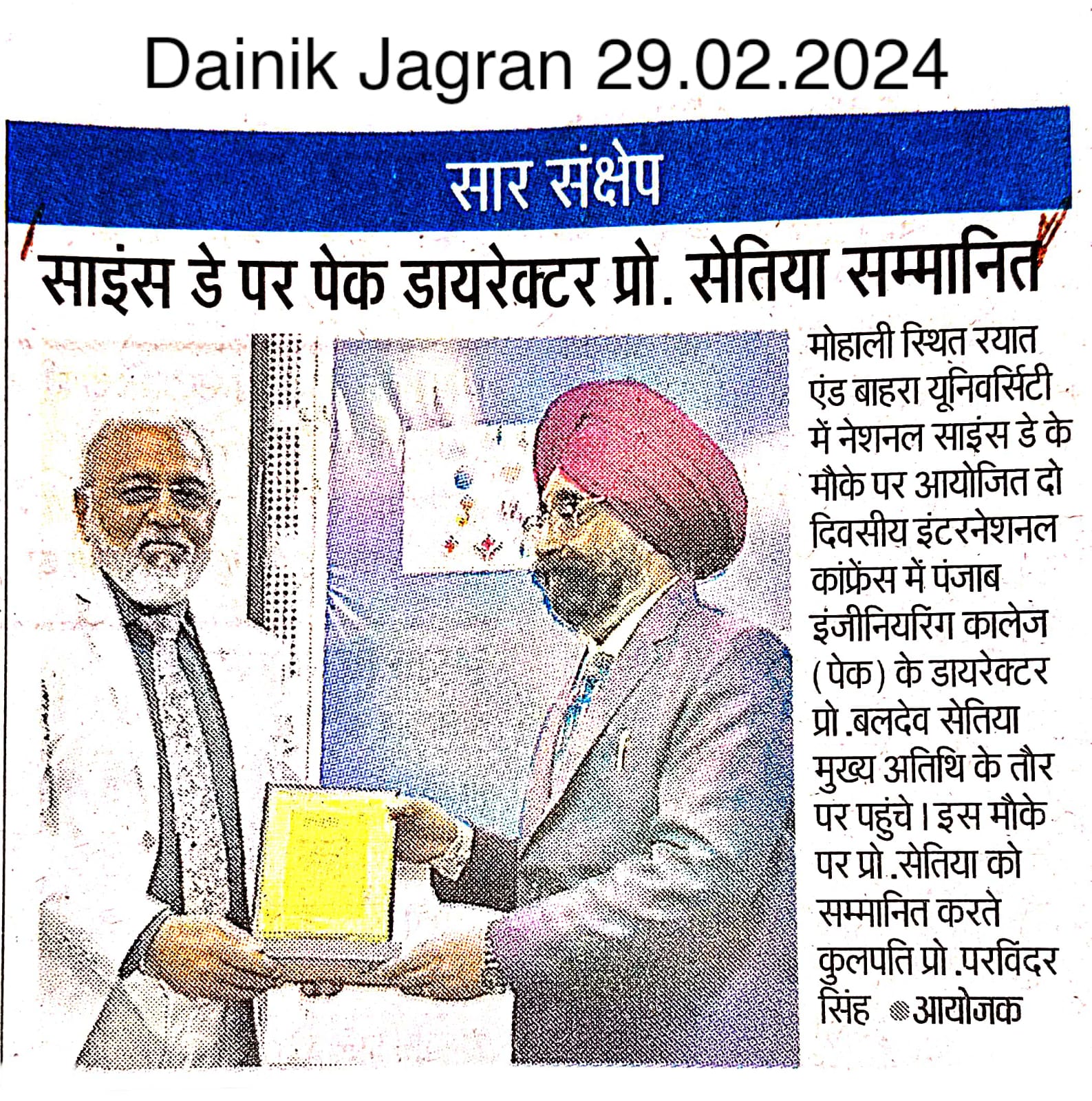 Director PEC Prof. Baldev Setia awarded by Rayat-Bahra University, Mohali |