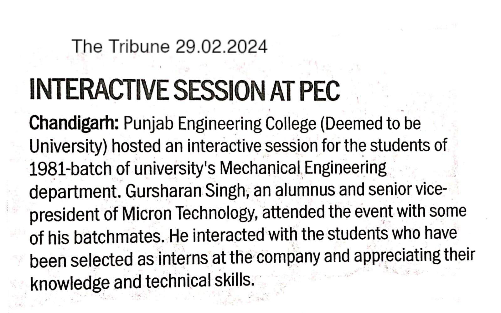 PEC Alumnus Mr. Gursharan Singh (1981 batch) had an interactive session with Students |
