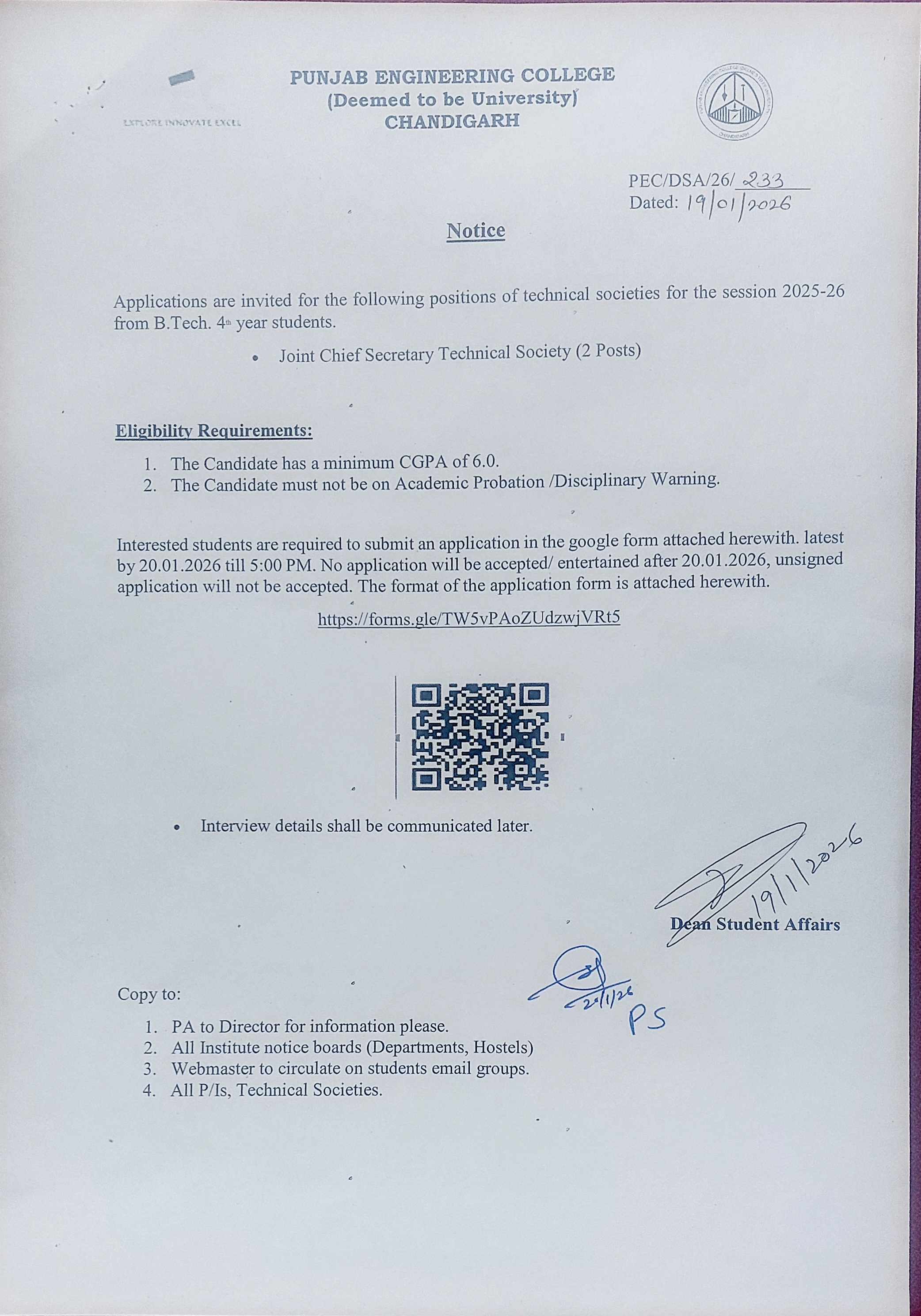 | 3 | Dean Student Affairs | Applications are invited for the Joint Chief Secretary Technical Society for the session 2025-26 from B.Tech. 4 year students. |